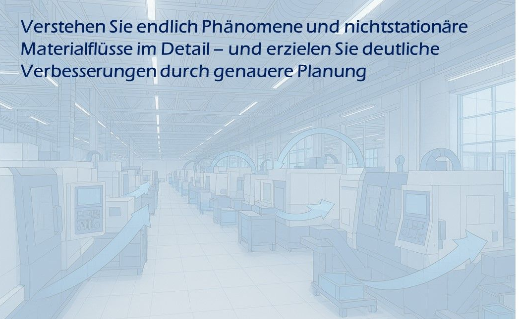 Die Materialflusssimulation (basierend auf Discrete Event Simulation, DES) ermöglicht es, das Verhalten eines Lagers, einer Fabrik oder eines ganzen Liefernetzwerks realistisch vorherzusagen. Viel präziser als mit rein analytischen Methoden lassen sich die Auswirkungen von Losgrößen, Auftragsreihenfolgen, Bearbeitungsregeln, Transportsystemen oder Anlagenverfügbarkeiten (OEE) untersuchen.